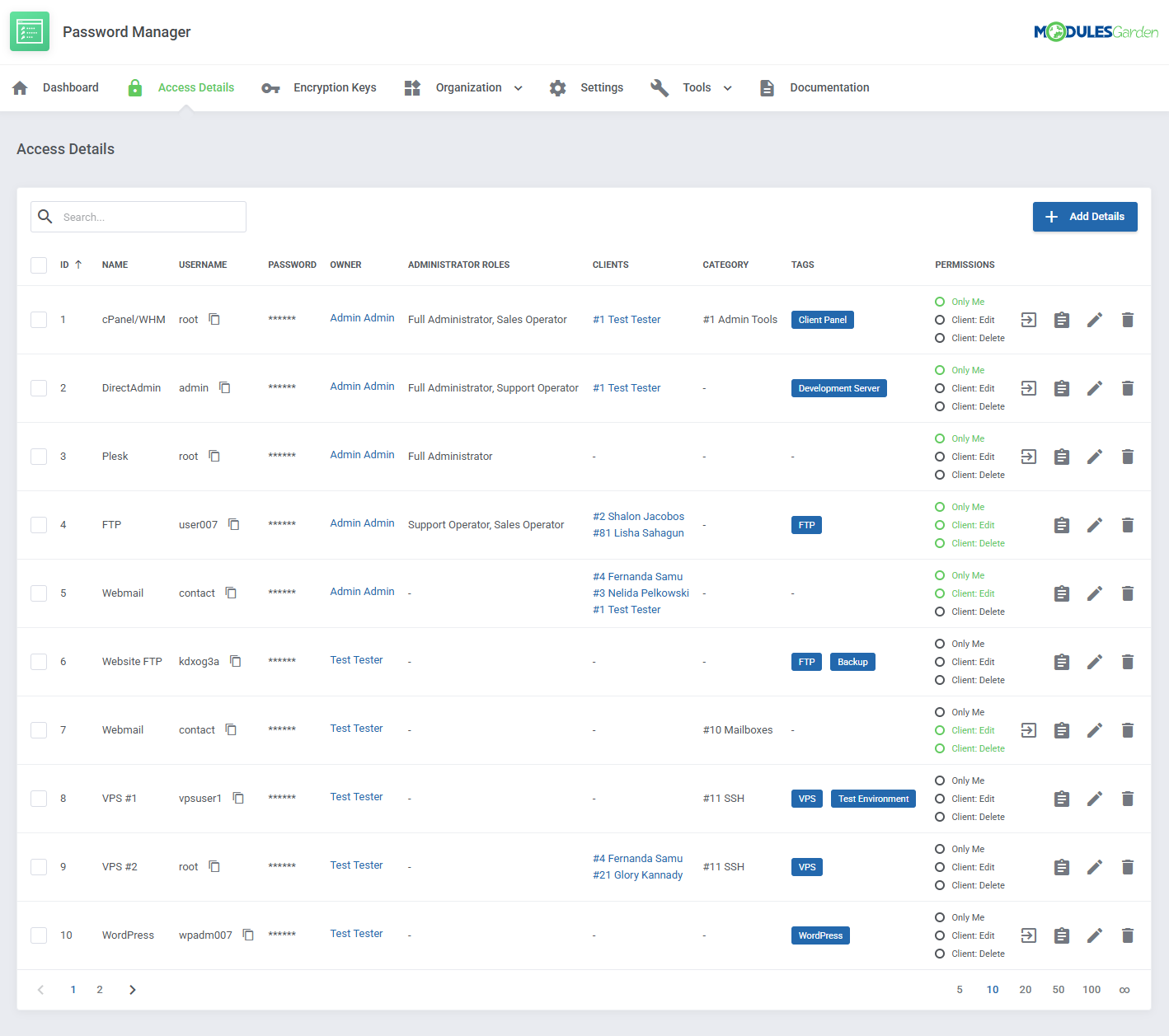 Its well-planned concept combined with ACL support empowers you to freely decide who should have access to particular passwords, notes, and other details. Additionally, you can create personalized notifications about password updates and reminders, both delivered by email to selected users or groups at scheduled times. To help you stay in full control, Password Manager For WHMCS lets you filter data using custom tags and track every change through extensive logs. It also integrates with your client area so as to offer easy viewing and, more importantly, sharing of the data among your customers. They have the tools to securely manage any owned details, including those linked to their products and services.
